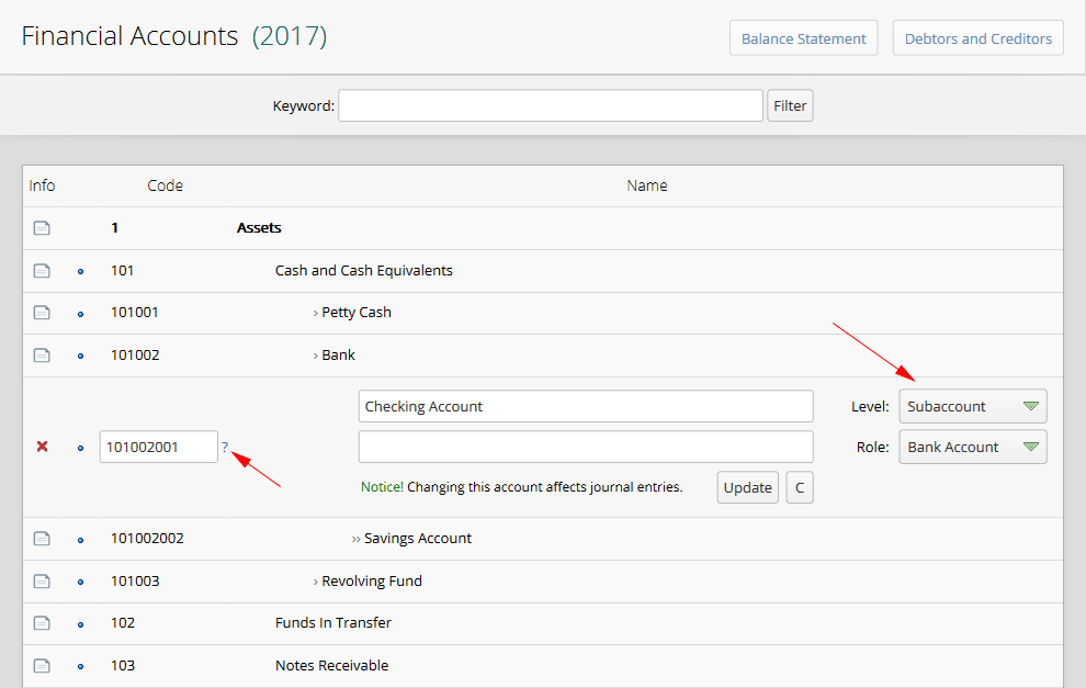 Dynamic Finance In order to reaching to features like financial accounting, general journal, treasury, liquidity control, check, bank and also information analyzing, Dynamic Finance should be installed. In general, while entering to the system, the fiscal year should be specified. If the basic information about fiscal year is not ready, system would show an alert to the user which is based on fiscal year preparation. Users will have the ability for confirmation of fiscal year preparation, in case that they have the "admin" user access level. By the form confirmation, all of the information about financial accounts and the whole settings for financial accounting system will be fetched from previous year and write into the new fiscal year. Thus before ending a fiscal year, prevention of making next fiscal years is recommended in order to transferring final settings and changes during the cycle of the present year and system would not demand further information settings in the new fiscal years. There is a section which name is “Financial Accounts” in “Settings”menu, which is used to define financial accounting coding for the present fiscal year. The basis of accounts definition is based on the manner of accounts coding and determination of accounts levels. By clicking on the question mark which is shown on the below image, the help file which is related to the codes structure introduction will be displays. If it is required, we also select the role of desired account in the treasury: