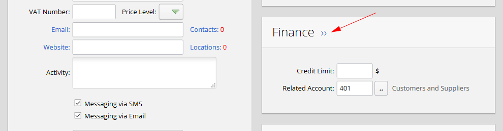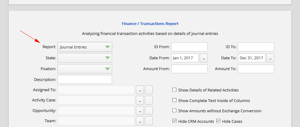 Also, one of the most common items is journal entries report. In the accounts profiles, there is a section which name is "Finance". By clicking on the finance link, the system will forward the user to journal entries report and will automatically initialize related values to financial "Account" and "CRM Account" fields in order to simplify the process of consideration of crm account's financial operation: