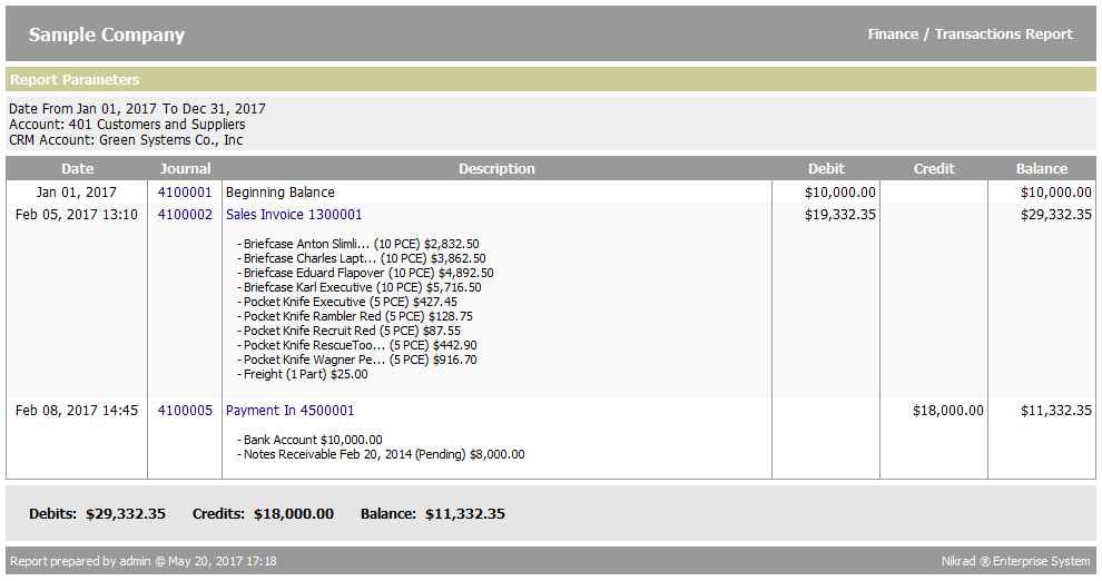 In the below image a sample of journal entries report that is called from a crm account profile and in the "Show Details of Related Activities" state is illustrated: