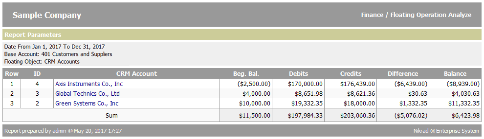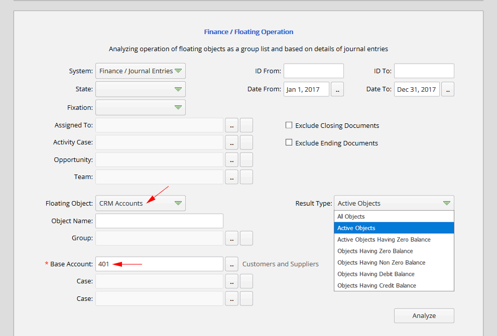 One of the most practical reports which exists in analyze section is "Floating Operation" report. It works based on a special financial account and has the property of checking operation of floating objects such as crm accounts and cases (cost centers, projects and so on). For example as it is shown in the below image, list of crm accounts and their operation rates which are interacted with the “401 Customers and Suppliers” financial account is desired: