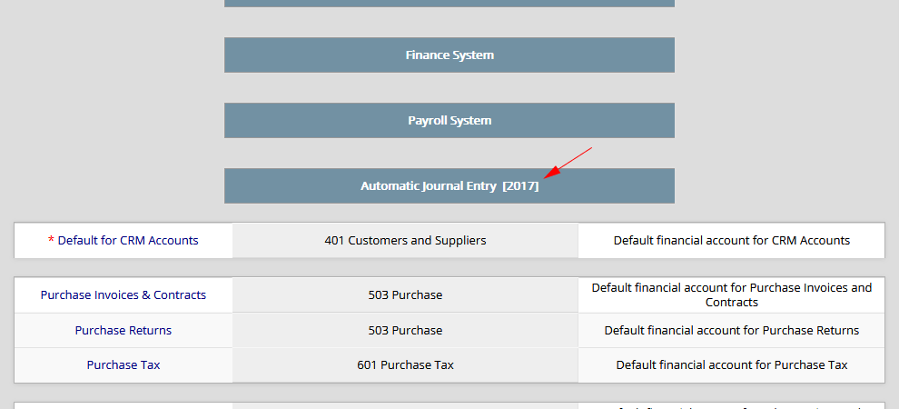“System Settings” section is available in the “Settings” menu. In this section it is possible to define how to issue automatic journal entries. Financial accounts that are asterisked must be specified. After reading this chapter, please go to the related section and check all the details: