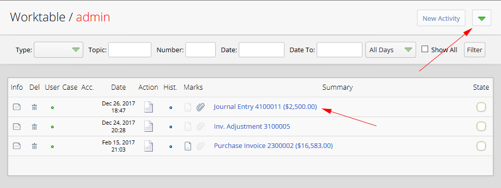 As mentioned in the previous chapters, in order to register a dynamic activity we may do so while we are in the section of the related system unit. If we are in different sections such as worktable or account profile we must click on the green button as shown in the image below after which we will be asked to choose a system unit as an origin from the list of system units. In this example dynamic activity with the specified origin of “System / Finance / Journal Entries” has been created: