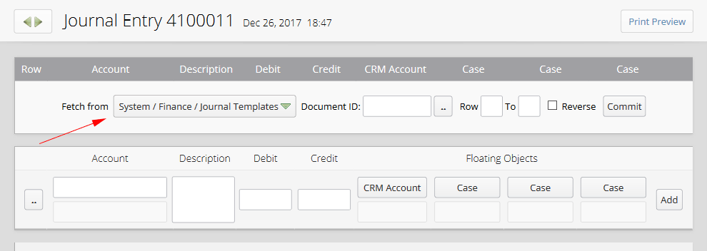 In the below image a journal entry is illustrated that is registered automatically while entering the Payment In operation 4500001. In this document there is a row which is added manually by the user. Despite the fact that automatic rows are non-editable, it is possible to omit or edit manual rows by clicking on row descriptions. We can use "Add" button in order to register a new row. For recalling the information from a journal template or another journal entry, the "Fetch" link is placed at the top of this button: