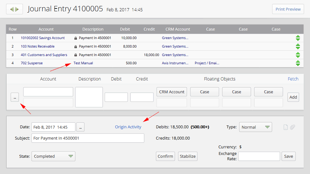 By clicking on the "Origin Activity" link, the activity which its registration causes to automatic issuance of the present journal entry, will be displayed on another tab. An origin activity could be a sales or purchase invoice or contract, payment in and payment out form and so on. Generally implementing any changes on the origin activity causes related journal entry rewrite automatically. In this case all the manual rows which are added by the user to the journal entry will stay safe without any changes. Activity Fixation: By using the Stabilize and Confirm buttons, we can Fixate a Dynamic Activity and make it unchangeable. The icons of Confirmed and Stabilized activities will be distinguishable from one another to indicate their fixation status. For users to be able to fixate activities or access fixated activities, they must have been granted the appropriate access privilege. To edit fixated activities, we must unlock them. In other words, we must use the Confirm and/or Stabilize buttons to unlock and be able to make changes. Since fixated activities can’t be edited, we may use the Assigned To and/or History buttons to have them assigned. Moreover, to Complete them we must click on the State icon. Note: In the case that an automatic journal entry is confirmed or stabilized, while it is in fixed status, journal entry couldn’t change even if we make changes on the document origin activity (for example sales invoice or payment in form). Therefore deleting the origin activity will change status of the related journal entry from automatic and unchangeable to manual and changeable mode.