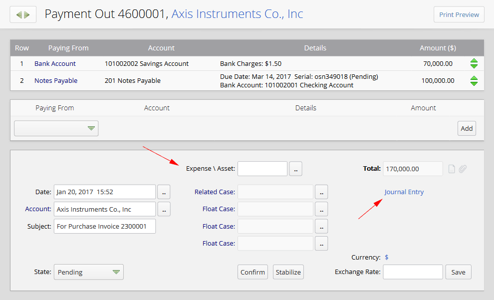 While setting all the actions about reception or payment operation, journal entry for that operation would be automatically issued and it would be reachable by clicking on the "Journal Entry" link. Three cases in floating form can be defined in Payment In/Out activities like Invoices, Contracts and Returns of Sales and Purchase. Such cases that have the ability to introduce a project or cost center could be stored in the related journal entry as floating objects, within the name of crm account. In the case that the Expense account is specified in Payment Out activities, the related journal entry will be set with that expense and activity crm account will be debited and credited in such situations. If crm account of activity not become specified, journal entry will be issued easier in which expense account will become debited and the source of payment will become credited. In order to transferring fund between petty cash, bank accounts and revolving funds, the account of asset should be specified in “Expense \ Asset” section which is related to the payment out form. In this case, the desired amount will be transferred to the specified account. Also in this section we can specify prepaid expenses account or attempt to purchase wealth and asset. In Payment In activities there is a Revenue account which can be specified. In this case, the related journal entry will be set with that revenue and the crm account of the activity will be debited and credited in such situations. If crm account of the activity is not specified, the target of payment will become debited and the revenue account will become credited.