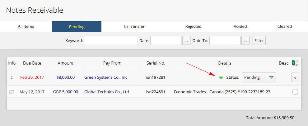 Status of notes receivable: pending / in transfer/ rejected / voided / cleared All of the checks are in "pending" status during the primary registration. While a check status changes, system would issue the relevant journal entry automatically. Issued journal entries which are related to the checks status are able to be edited or omitted by users. In the case that a check changes to pending state again, system will automatically omit all the previous journal entries which are related to the status change of that check. Here we will review some practical notes: