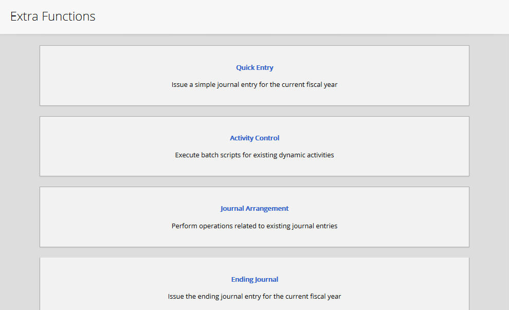 Extra Functions There are set of embedded functions defined for user convenience. Extra Functions could be accessible through the system submenu, If the access permission to "Journal Entries" and/or "Extra Functions " have been granted to the user: